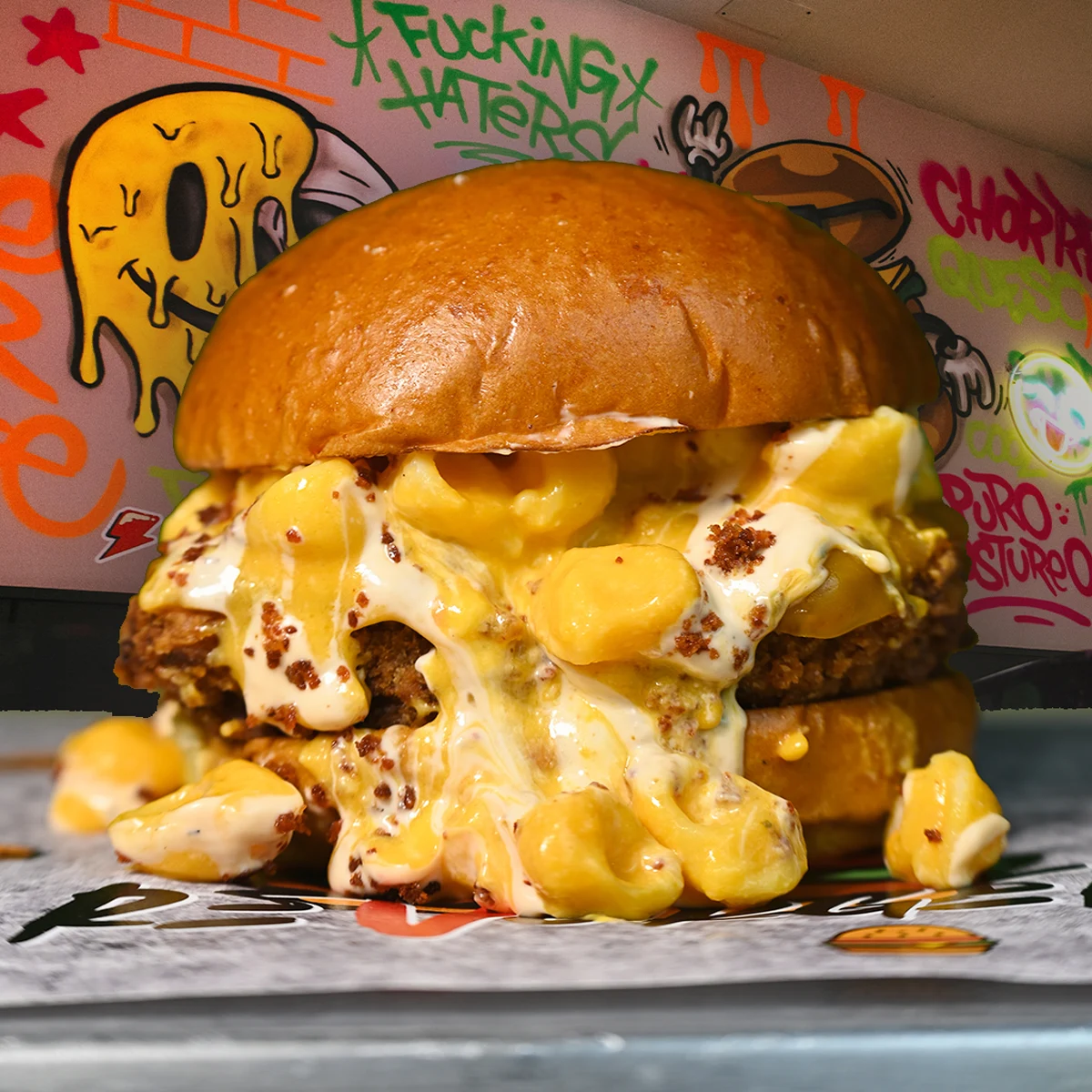 Contra de pollo rebozado al estilo que te vuele la cabeza, salsa secreta, polvo de bacon y unos Mac and CHIIISSS!! Sobre nuestro pan brioche artesano.